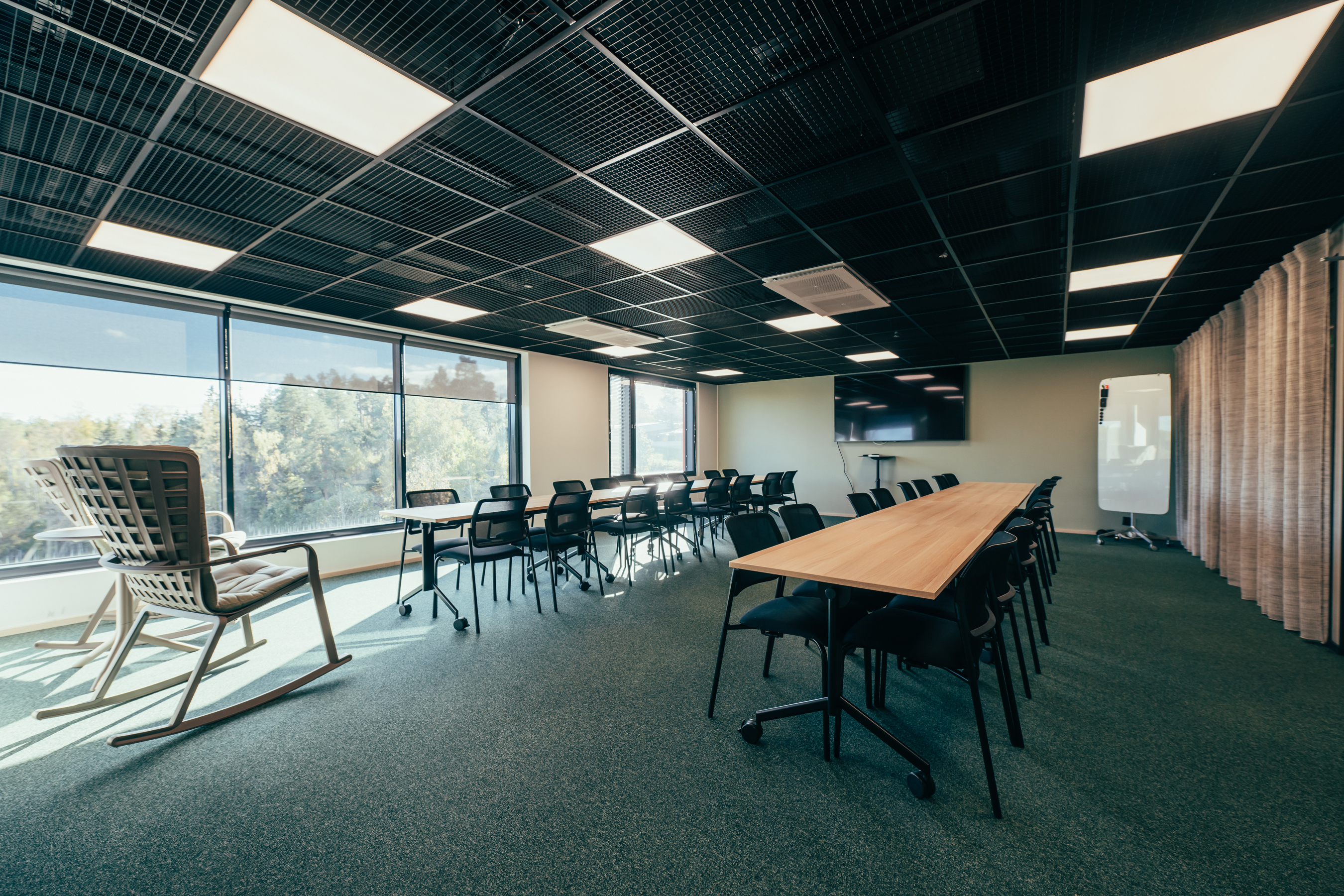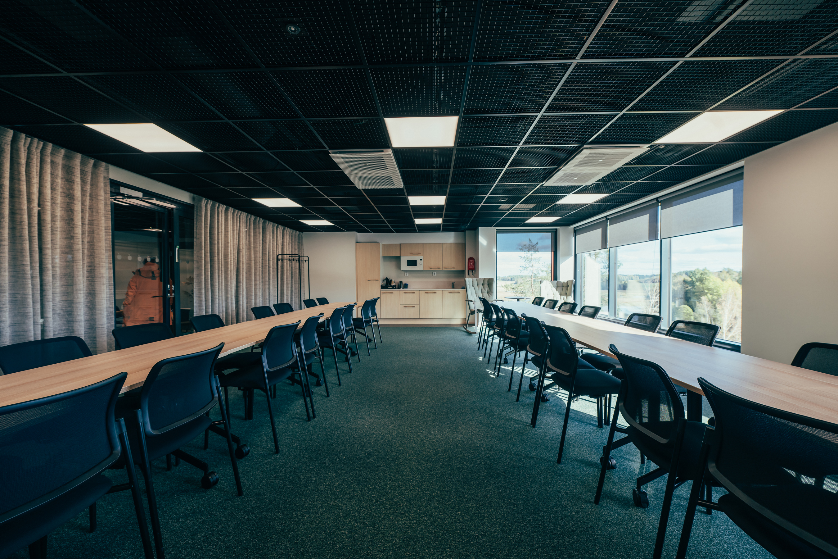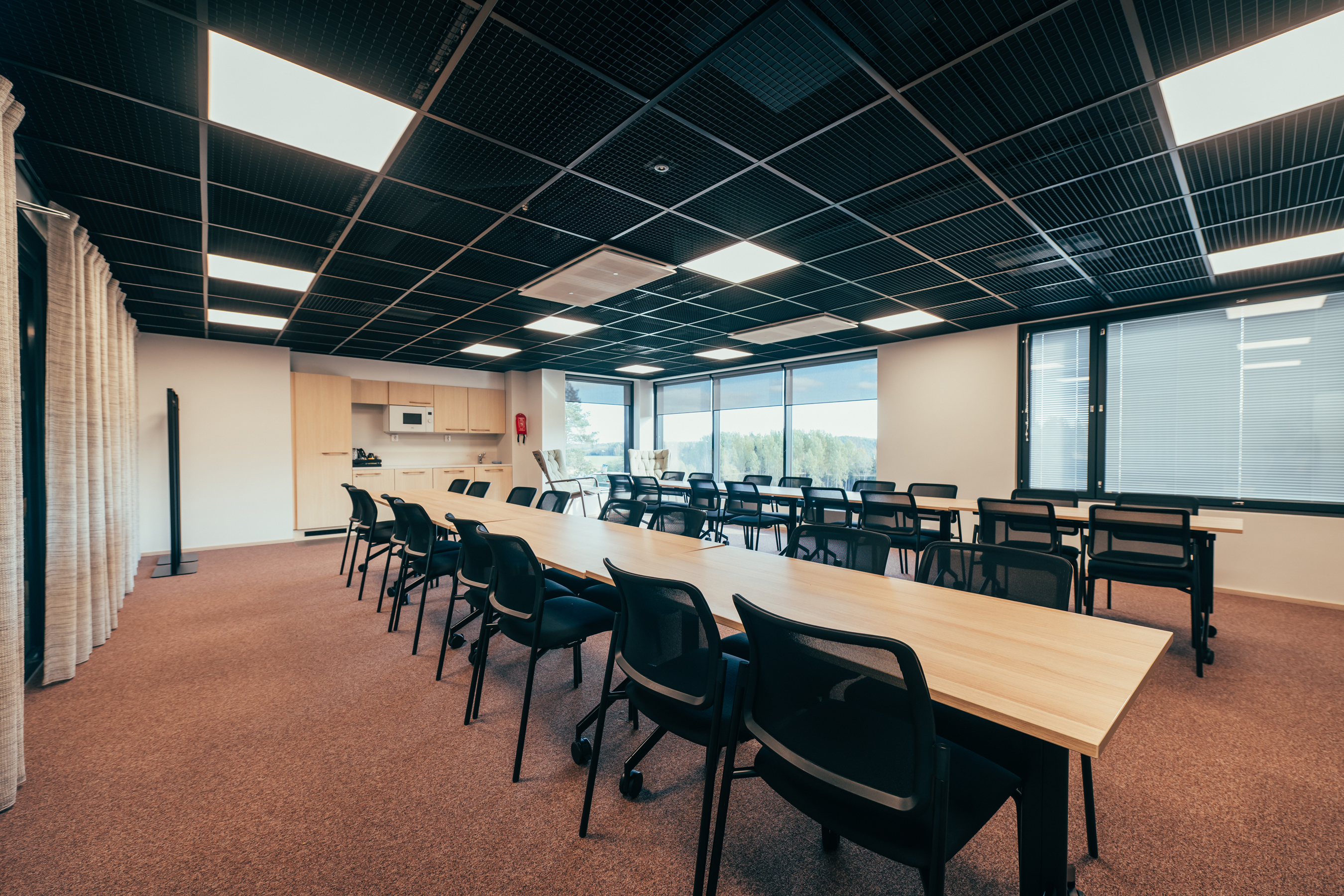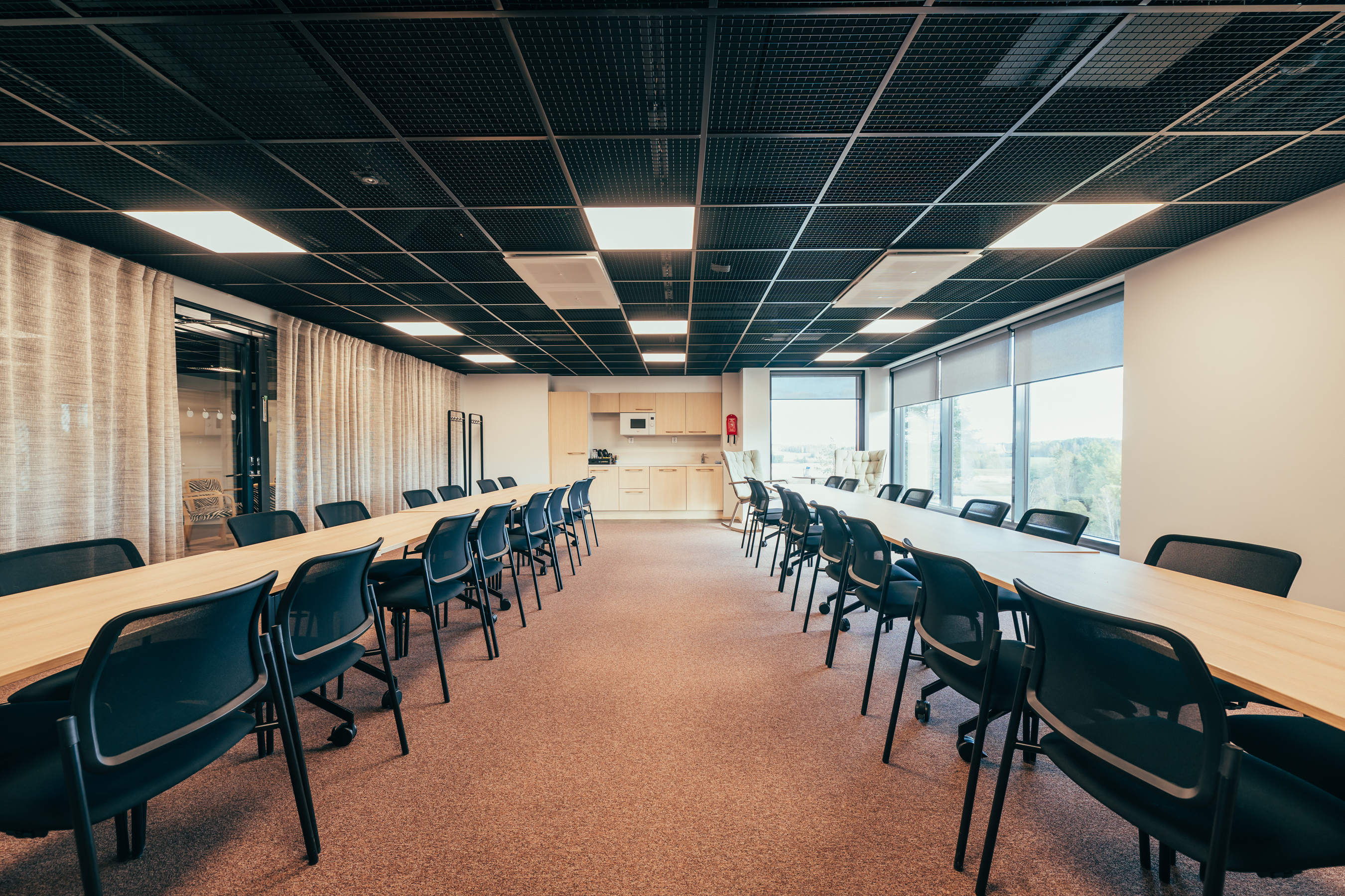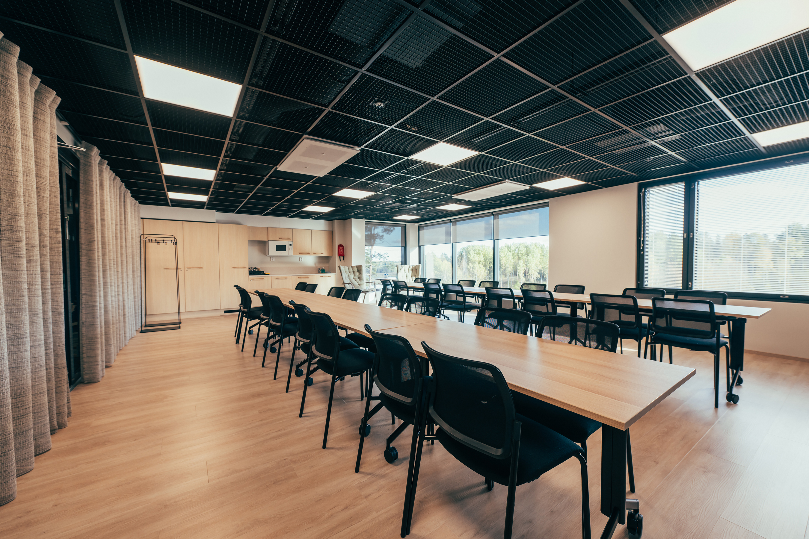 - Kokouspöydissä pyörivät jalat, pöytämuodot helposti muokattavissa