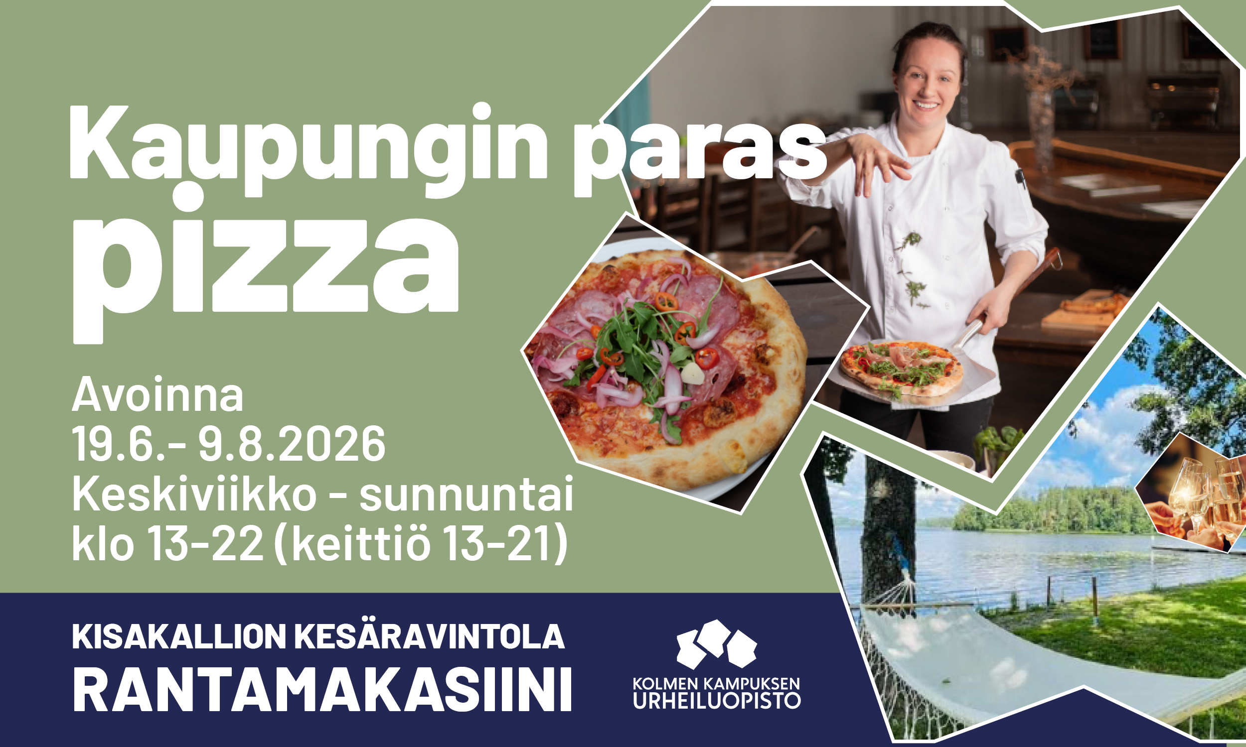Juhannuksesta elokuun alkuun asti herkutellaan Kisakallion Rantamakasiinissa! Rantaravintolan pizzeria palvelee asiakkaita keskiviikosta sunnuntaihin 19.6.–9.8. klo 13–22 (keittiö klo 13-21). Lämpimästi tervetuloa!